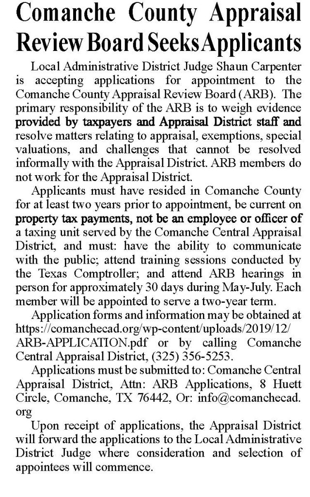 We ran the ad below in the Comanche Chief & De Leon Free Press on 1/25/24 & 2/1/24 to try and get ARB applicants.